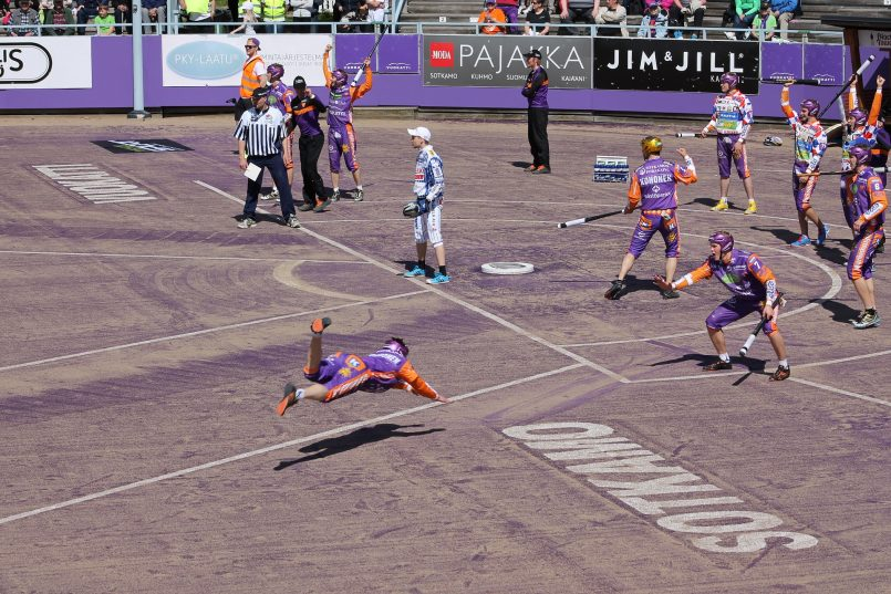 Pesis is a dramatic sport—slides are made headfirst, almost all good catches are diving, and the uniforms are fantastically bright. So, naturally, I initially saw the sport on Instagram. While it hasn’t yet reached showstopping fame, the professional pesäpallo league has an account (@superpesis), where they post highlights and clips from games. But while most catching highlights follow the same routine as baseball, some are even more spectacular. Pesis games are often played outside, and instead of a stadium setup, there are no outer walls. If a ball bounces before it goes out of bounds, it’s a fair ball. Pesis players will chase the ball down into a creek, out onto the concrete surrounding the field, or anywhere else.