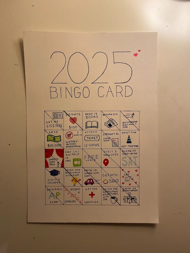 On New Year’s Eve 2024, my family and I swapped out the traditional New Year’s resolutions for a new approach to self-improvement: a five-by-five bingo card, with each square representing a goal we’d like to accomplish at some point during the year. Now that 2025 has come to a close, I’m reflecting on what I’ve accomplished this year. There were highs and there were lows, but overall, I’m pleasantly surprised with my commitment to my goals.