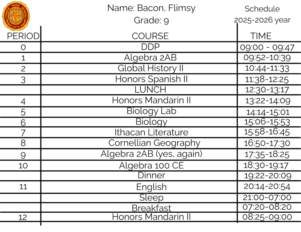 To overview this policy, there would be breakfast and dinner in addition to lunch. The school day would start at 09:00, starting with zero period (which would be mandatory for all students to take). In all, there would be thirteen periods, with additional time for the three meals and sleep (sleep runs from 21:00 to 07:00 the next day). Adding on, long after school, there will be loads of homework assigned to each student to fit all the week’s curriculum. What if the students get burned out? There will be short breaks in each period, lasting five minutes maximum. Each period would last at least thirty minutes but no longer than fifty minutes.